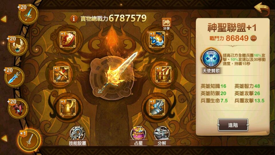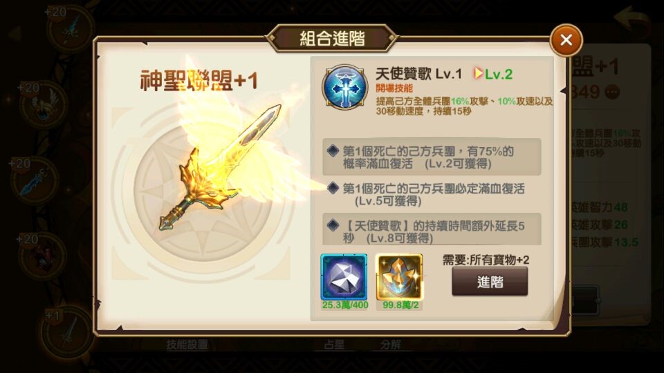 LV17:當神聖聯盟復活兵團後,為己方所有兵團增加【士氣高漲】持續20秒。